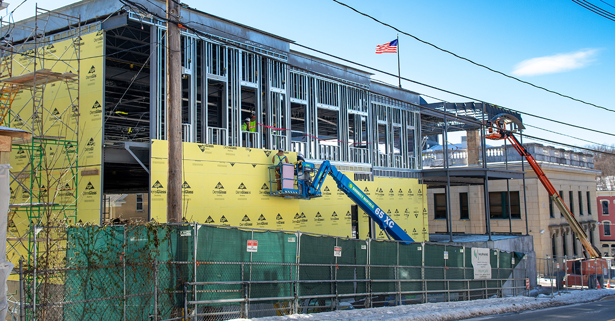 By February, wall framing and sheathing were installed to enclose the structure