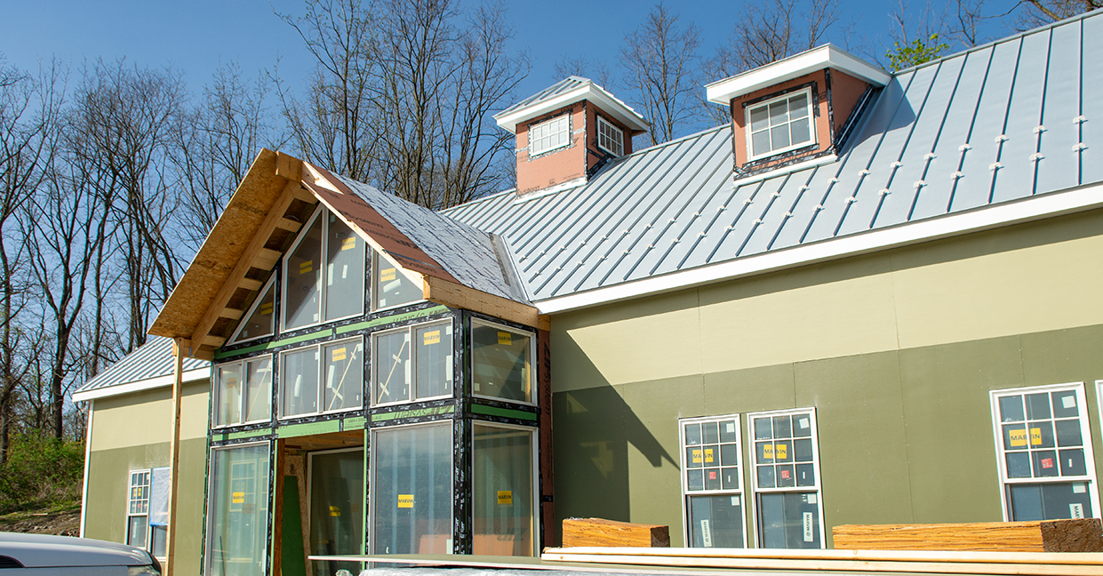 By March 2025, the majority of the roofing and siding were installed, and interior work could begin