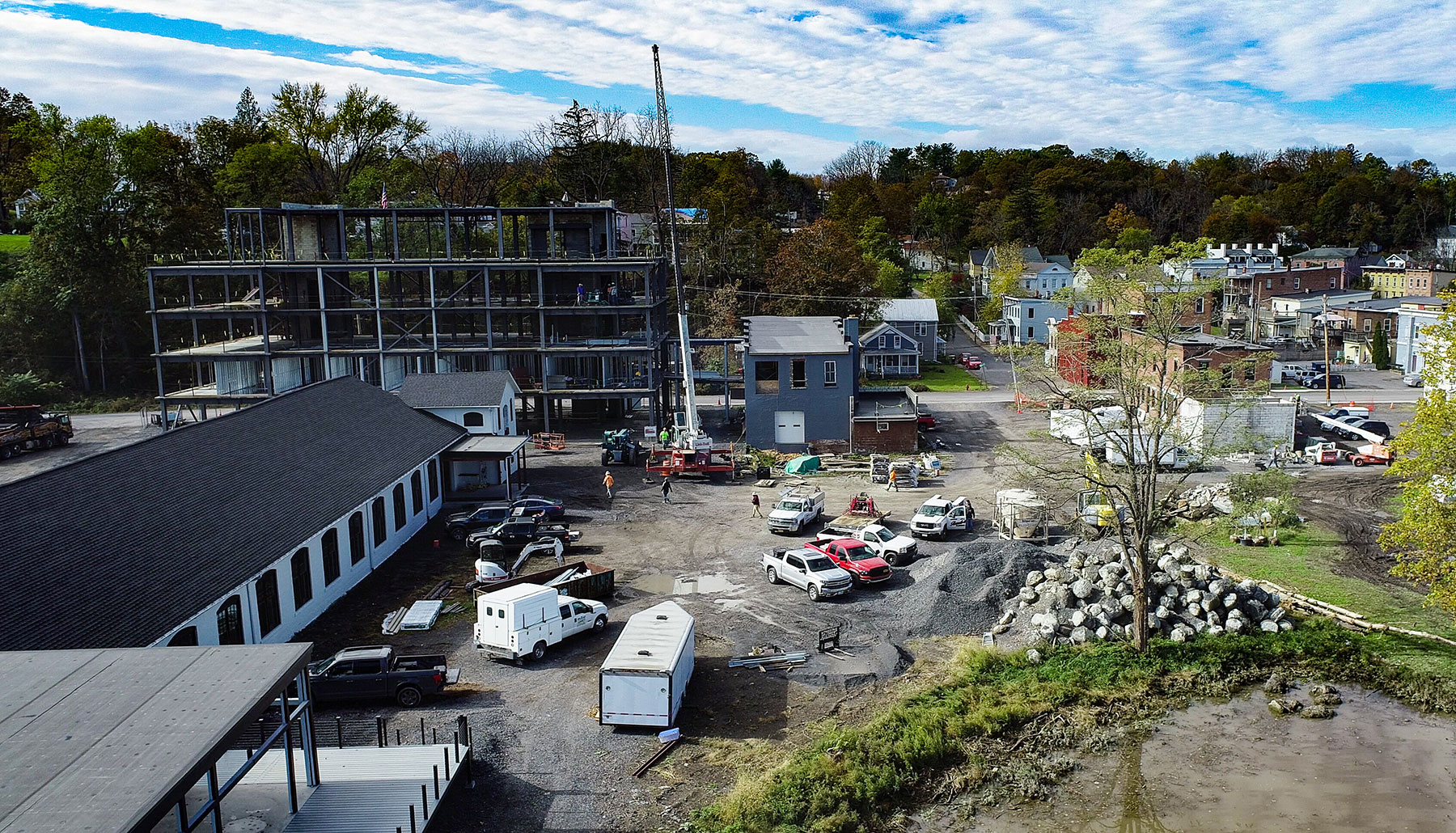 Rising behind the signature mural logo of the Patrick Henry Tavern (under full renovation) the new steel for the James Newbury Hotel is erected by crane. Staircases and Elevator Shafts are in place, and the entire event property is taking shape along the Hudson Riverfront.