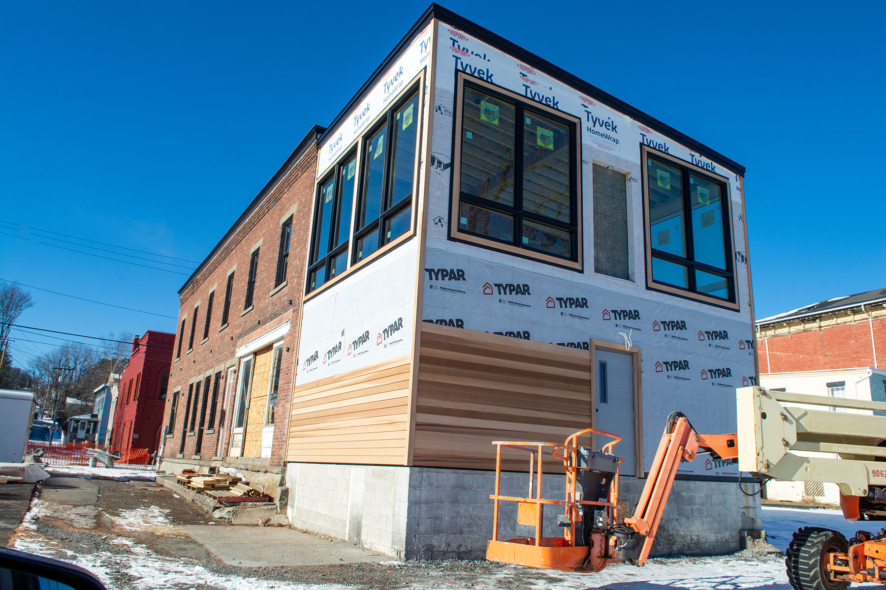 No need to slow the work for winter weather! Progress on the Wire Event Center and James Newbury Hotel continues. Zip sheathing and siding are going up, and the glass walls around the bar area have been installed.